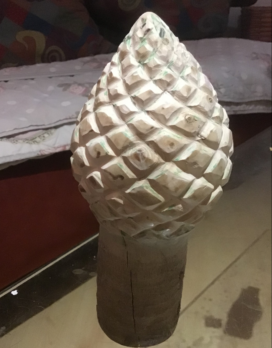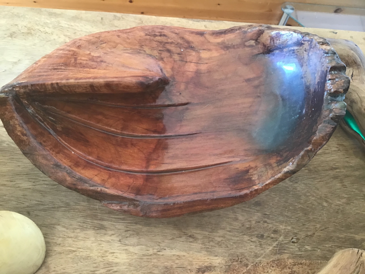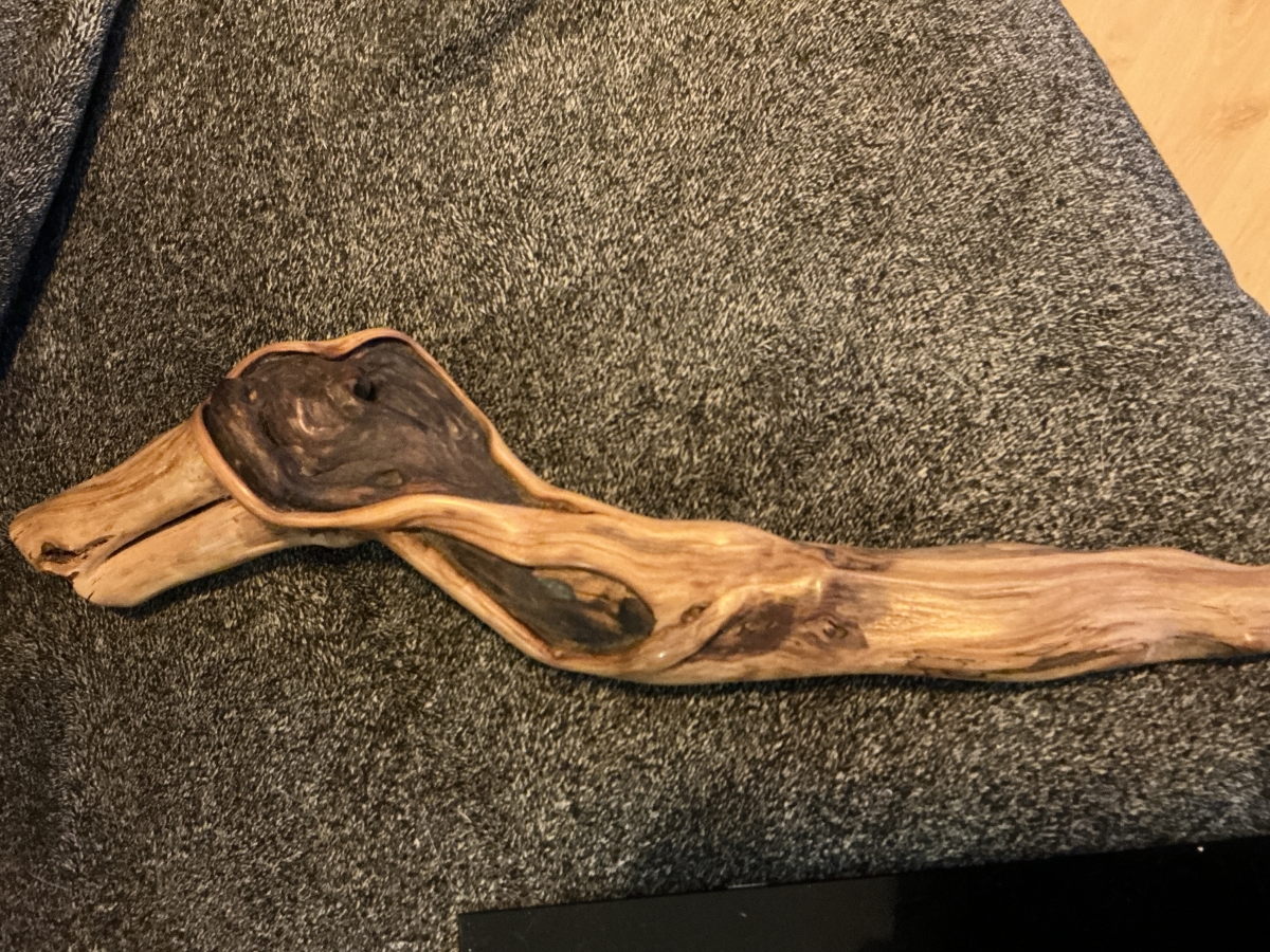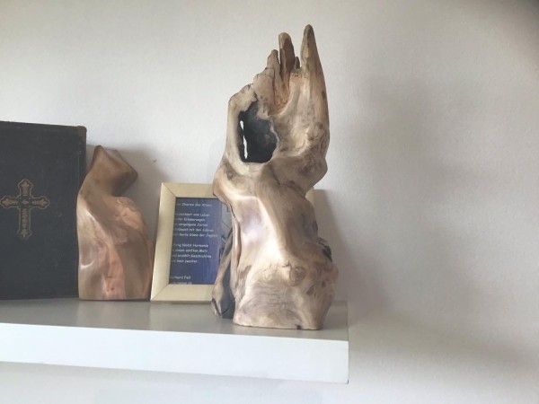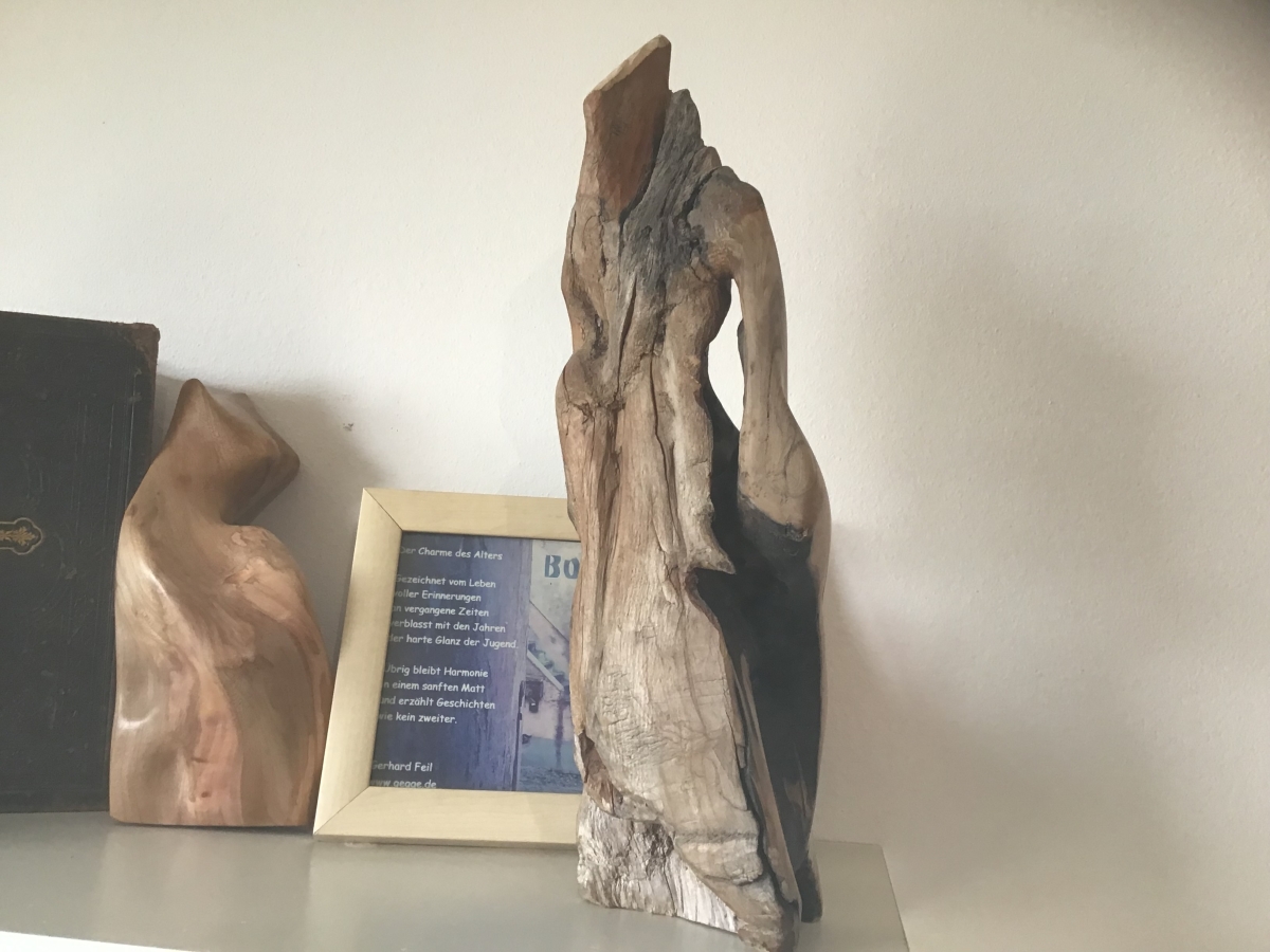 von Hand geschnitzt, mehrfach mit Kunstharz lackiert und geschliffen damit sich das faserige Material vollsaugt, Maserung zeigt und an Stabilität gewinnt.