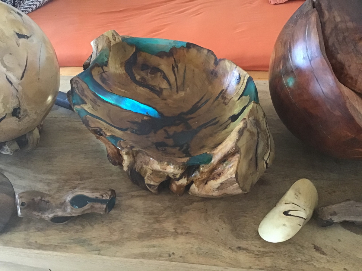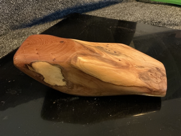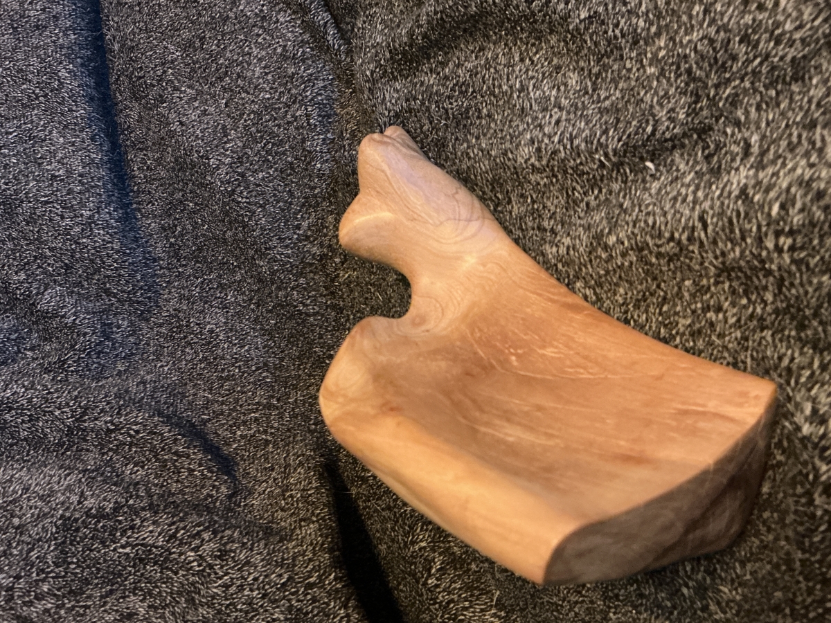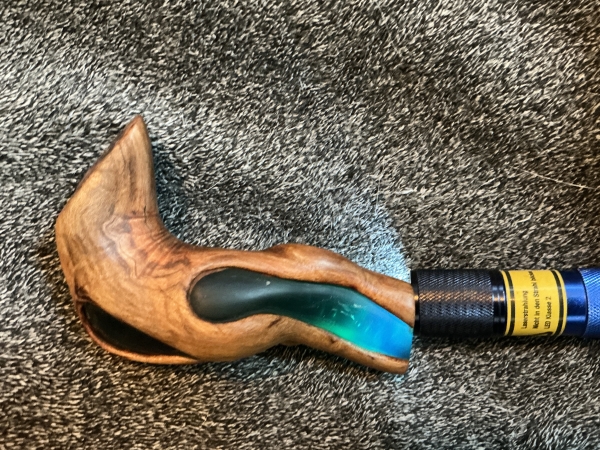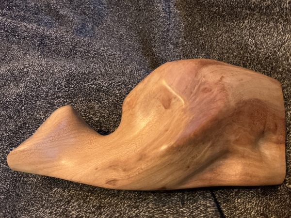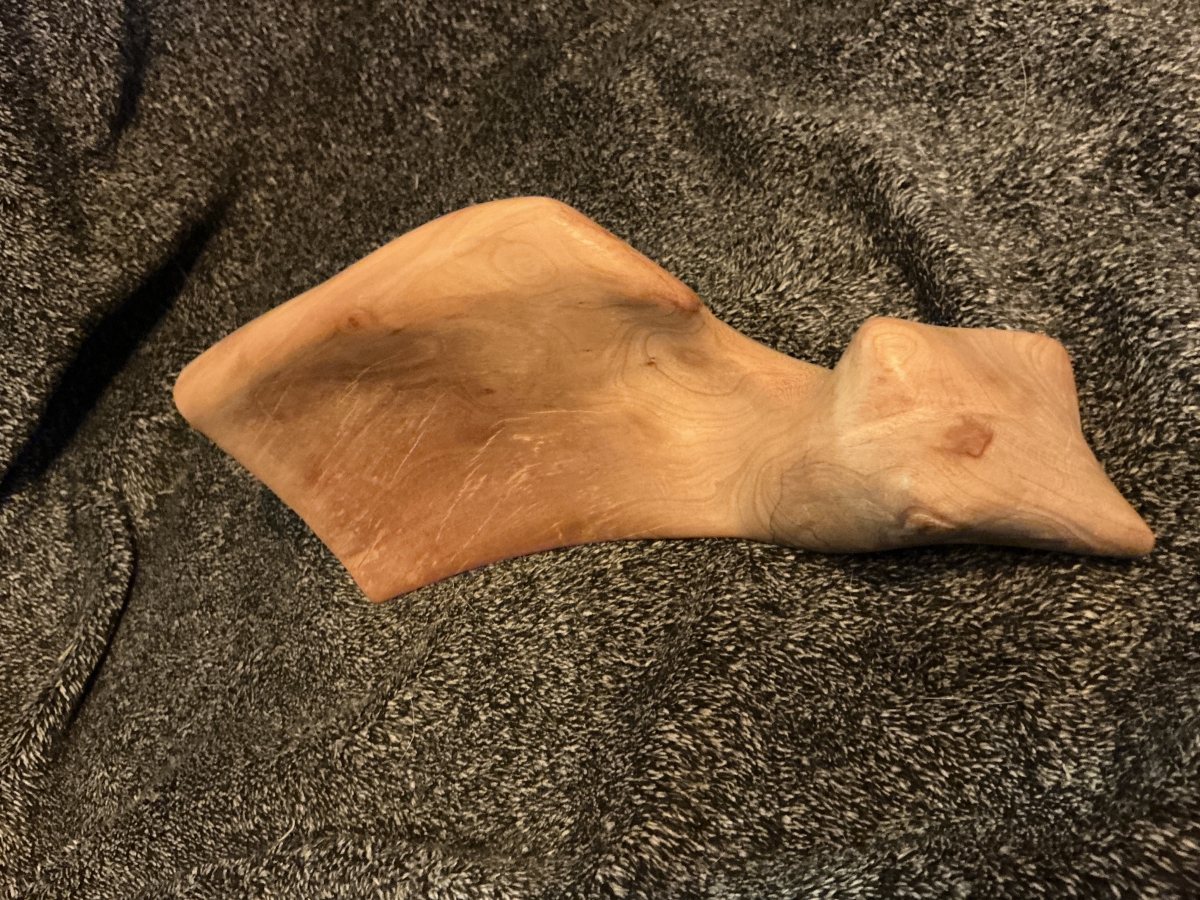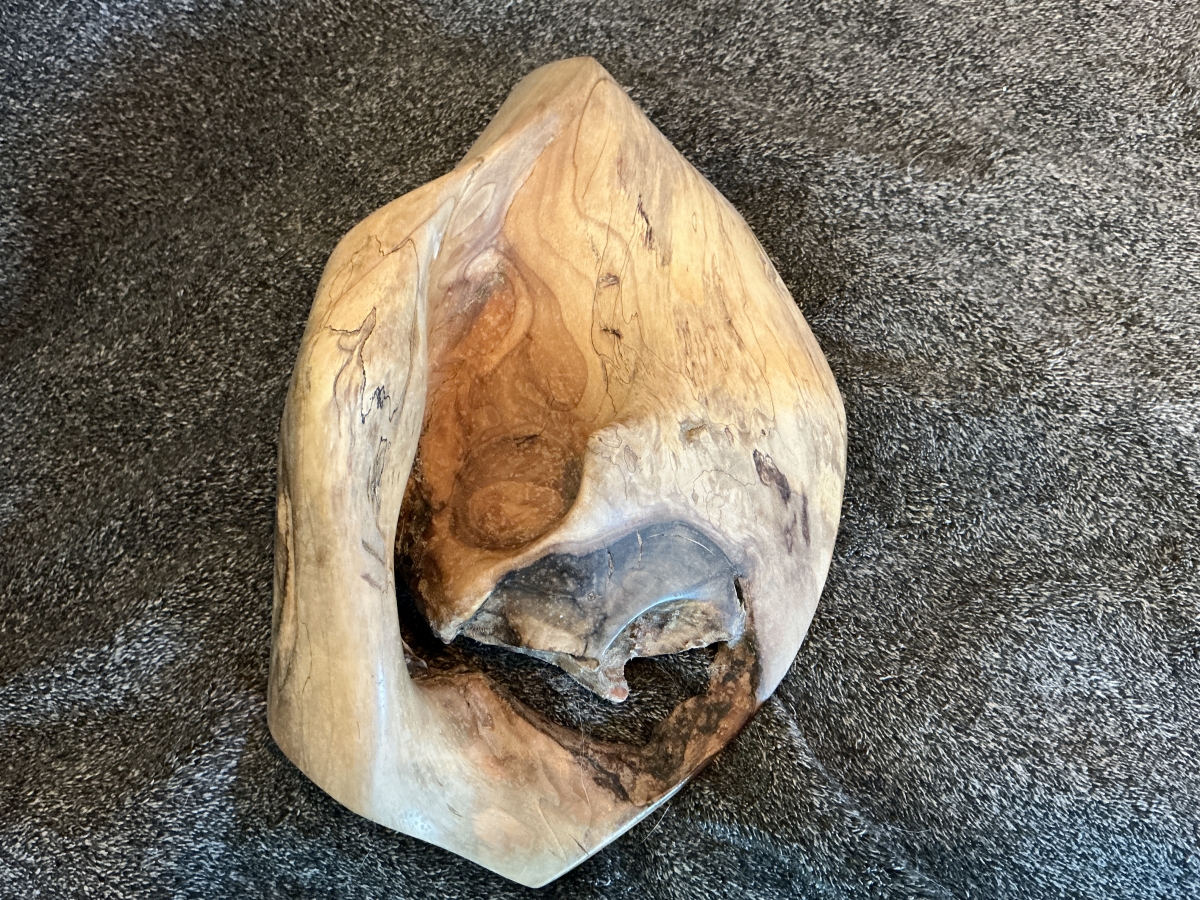 von Hand geschnitzt, mehrfach mit Kunstharz lackiert und geschliffen damit sich das faserige Material vollsaugt, Maserung zeigt und an Stabilität gewinnt.