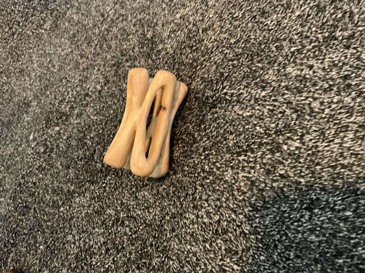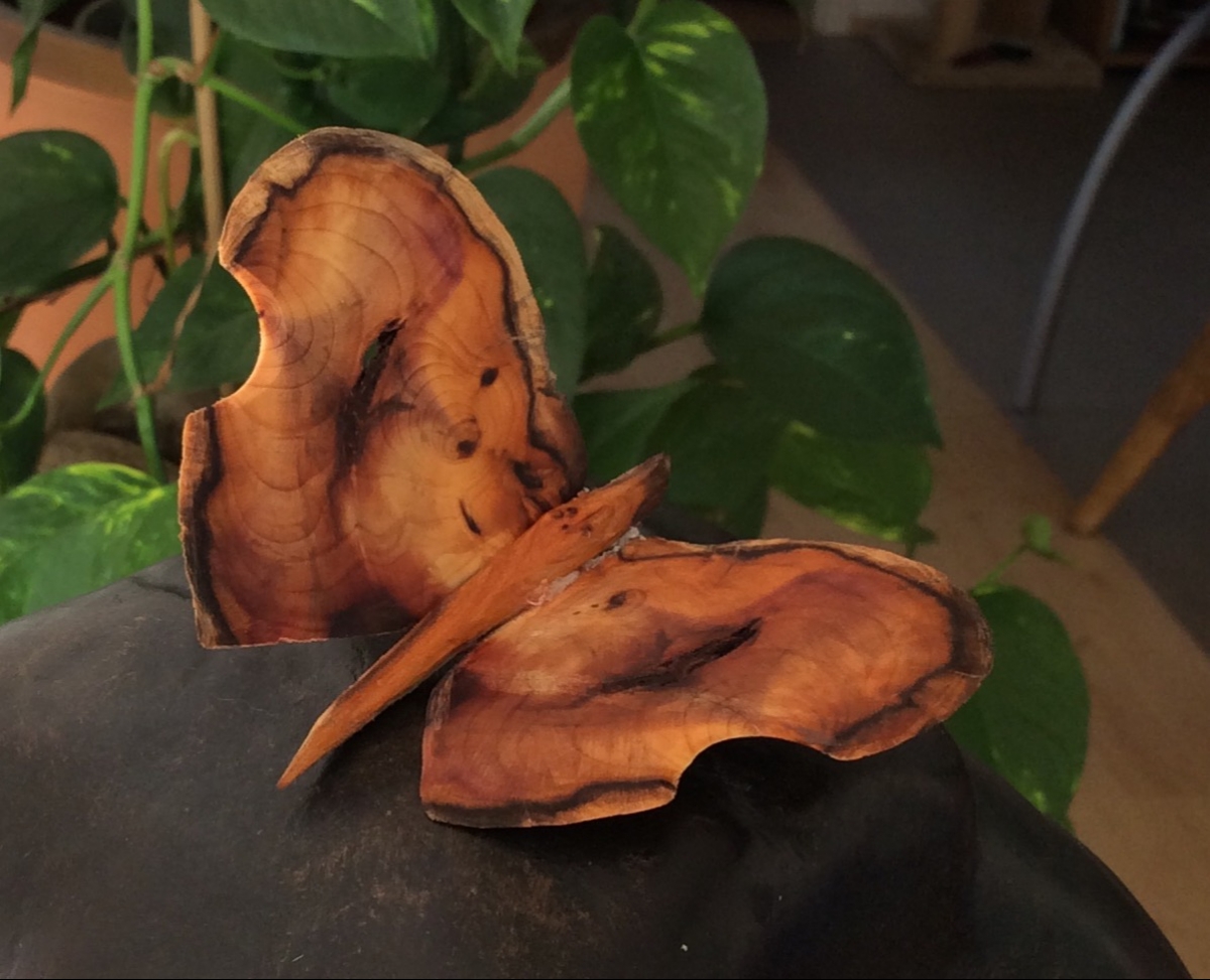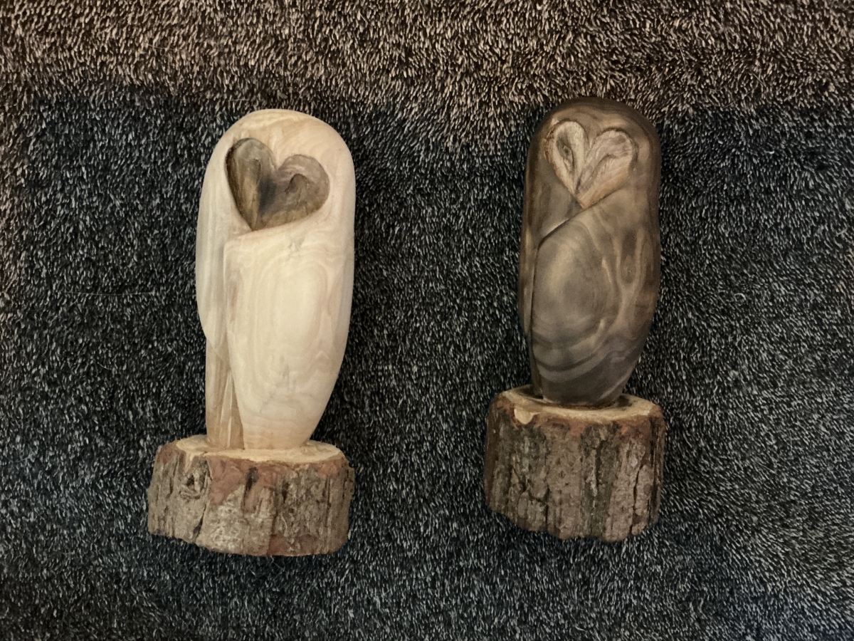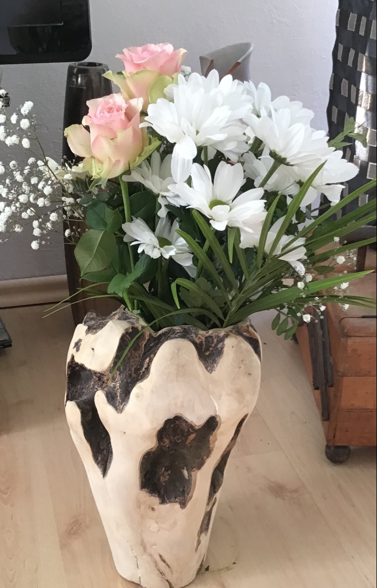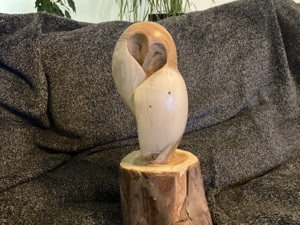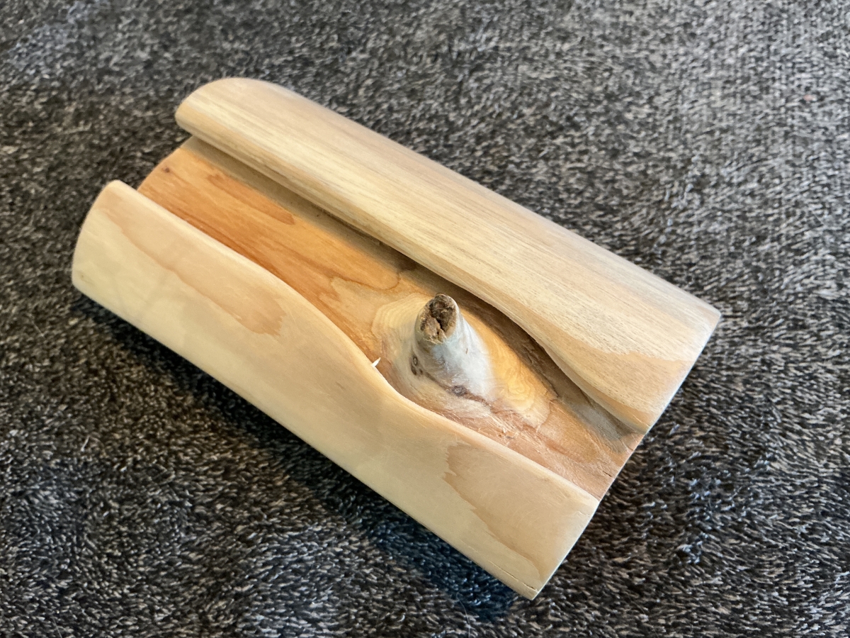 von Hand geschnitzt, mehrfach mit Kunstharz lackiert und geschliffen damit sich das faserige Material vollsaugt, Maserung zeigt und an Stabilität gewinnt.