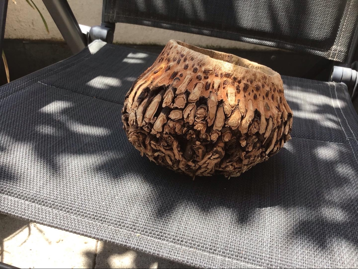 EXTREM seltenes Material, da die Palme ein gewisses Mindestalter haben musste und bei den meisten abgestorbenen Palmen genau dieser Pflanzenteil vermodert ist. Es handelt sich um den dünnen Bereich, an dem die Wurzeln in Palmtriebe übergehen.
